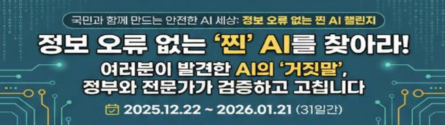과학기술정보통신부는 인공지능안전연구소와 함께 국민이 안심하고 생성형 인공지능을 활용할 수 있는 환경을 조성하기 위해 「정보 오류 없는 찐 인공지능 경연(AI 챌린지)」 캠페인을 오는 12월 22일부터 내년 1월 21일까지 한 달간 추진한다고 밝혔다.